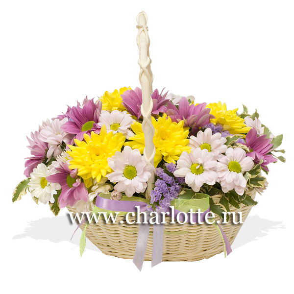 Корзинка из хризантем, статицы с декоративной зеленью. По Вашему желанию цветовую гамму букета можем изменить, для этого звоните в наши салоны цветов или указывайте в разделе "комментарии для флориста" при заказе через интернет.
