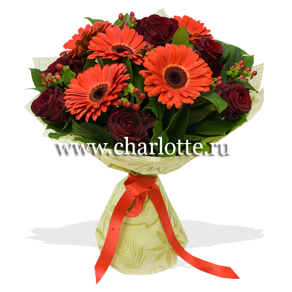 Букет в красных тонах из роз, гербер, гиперикума с декоративной зеленью. Цветы оформляются в подарочную упаковку на усмотрение нашего флориста. По Вашему желанию цветовую гамму букета можно изменить для этого звоните в наши салоны цветов или указывайте в разделе "комментарии для флориста" при заказе через интернет.