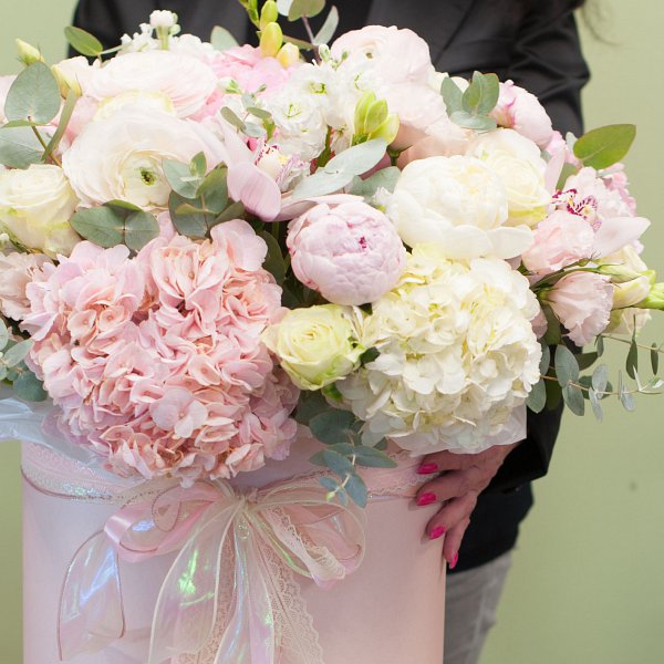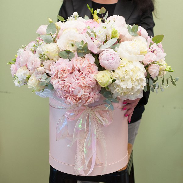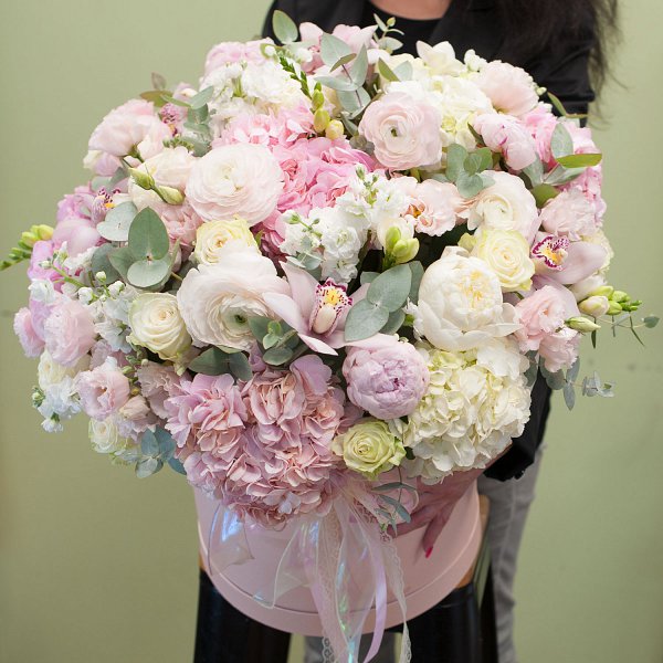 Шляпная коробка большого размера из гортензий, пионов, ранункулусов, фрезий, орхидей, маттиолы с эвкалиптом.