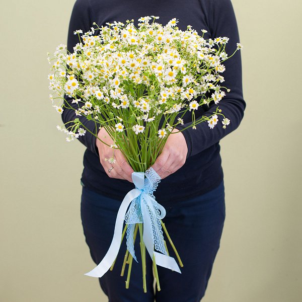 Сборный букет "Букетик ромашек" упакован в стильную ленту, которая подчеркивает красоту цветов и делает подарок еще более привлекательным.