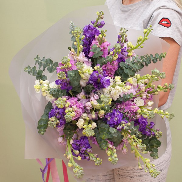 Букет из разноцветной маттиолы с эвкалиптом в дизайнерской пленке. Маттиола так же имеет приятный запах.