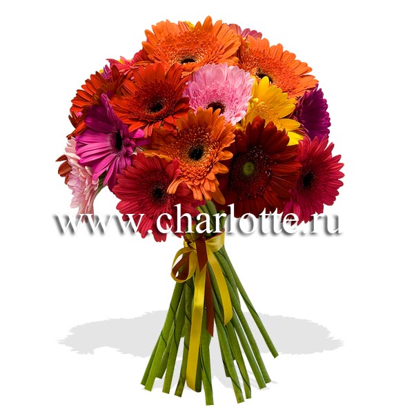 Букет из разноцветных гербер перевязанных лентой. По Вашему желанию цветовую гамму букета можно изменить, для этого звоните в наши салоны цветов или указывайте в разделе "комментарии для флориста" при заказе через интернет.