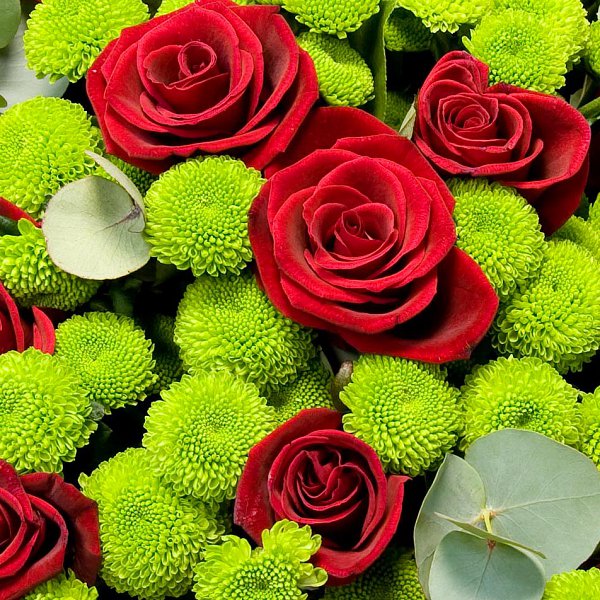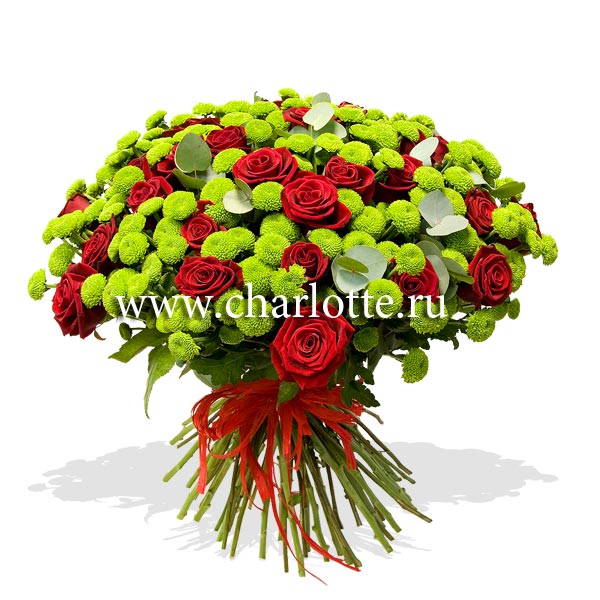 Букет в красно-зеленой гамме из роз Гран При, зеленой хризантемы с декоративной зеленью.По Вашему желанию цветовую гамму букета можно изменить для этого звоните в наши салоны цветов или указывайте в разделе "комментарии для флориста" при заказе через интернет.