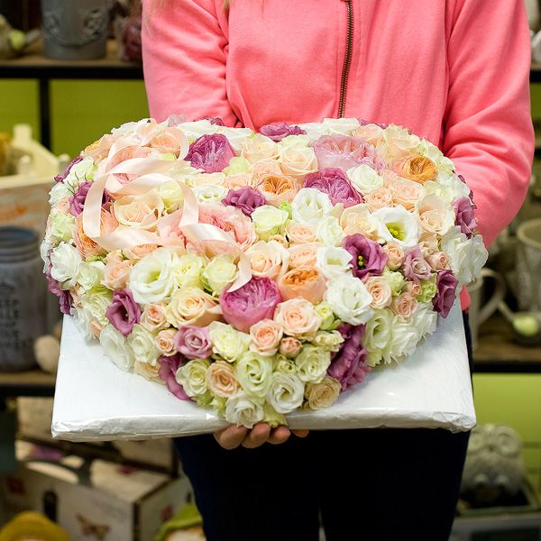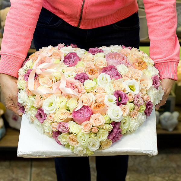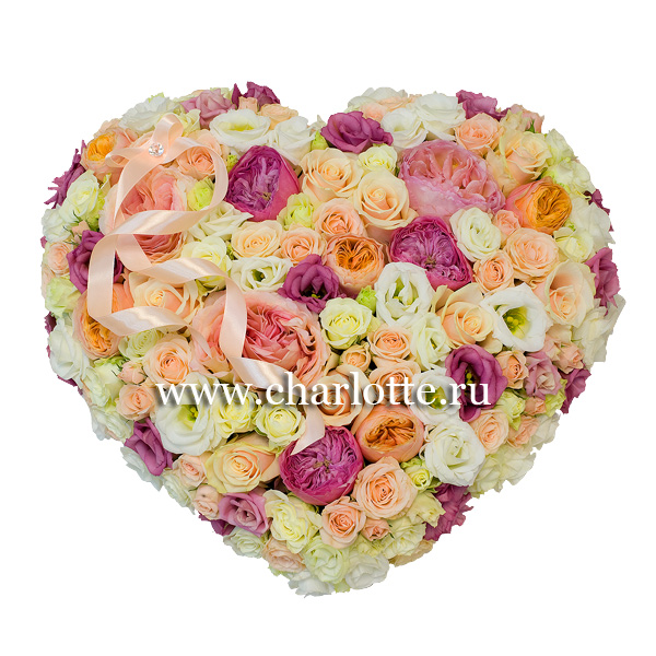 Композиция в виде сердца в нежных тонах из пионовидных английских роз, кремовых роз, эустом, кустовых роз. По Вашему желанию цветовую гамму композиции можно изменить,для этого звоните в наши салоны цветов или указывайте в разделе "комментарии для флориста" при заказе через интернет.