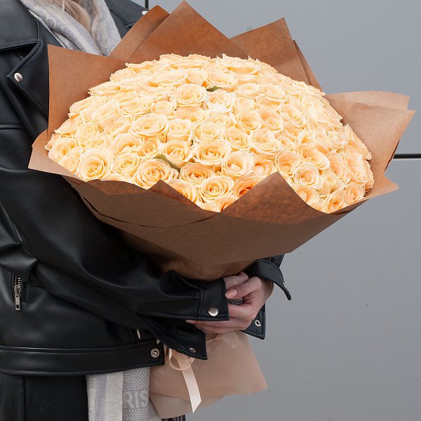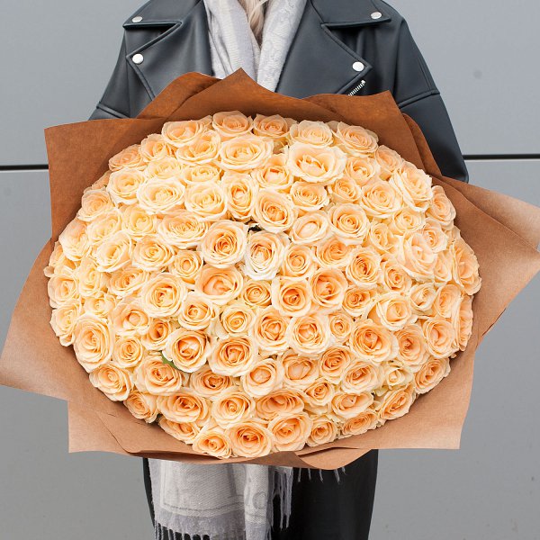 Букет состоит из 101 оранжевой розы сорта Аваланж Пич, что делает его ярким и запоминающимся. Розы собраны на стеблях и оформлены в крафт-бумагу, что придает букету еще больше элегантности и шарма.