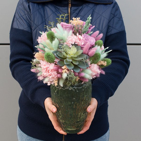 Высота букета составляет 50 см, что позволяет разместить его на любом столе или полу, не занимая много места.