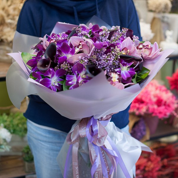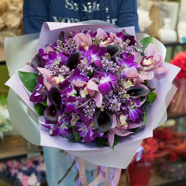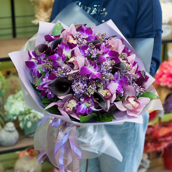 Букет "Аметист" собран из темных калл, которые придают ему глубину и таинственность. Орхидеи дендробиум и цимбидиум добавляют изысканности и элегантности, а сиреневая сирень вносит свежесть и легкость.