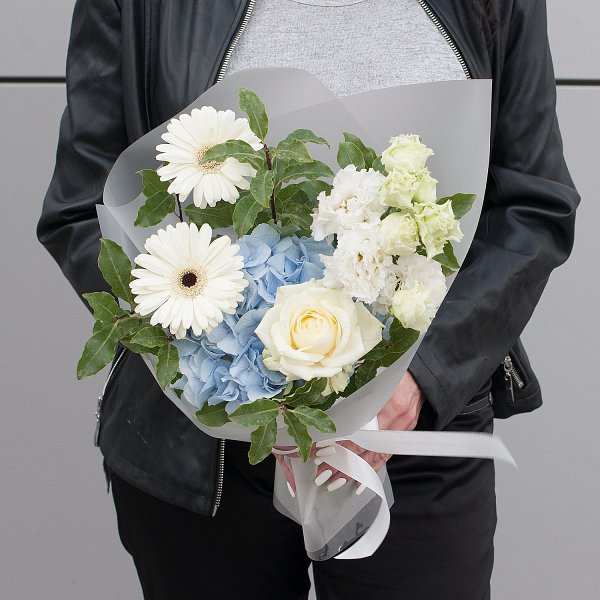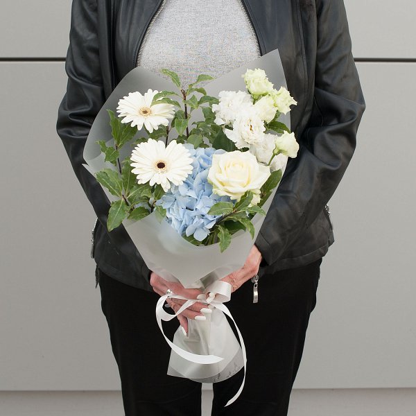 Букет выполнен в белом и голубом цветах, что придает ему свежесть и легкость.