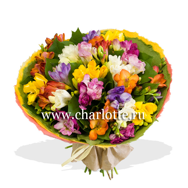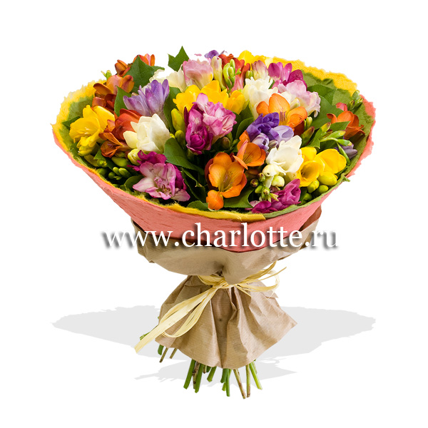 Букет из разноцветных фрезий с декоративной зеленью в эксклюзивной упаковке бумаги малбери и крафта. По Вашему желанию цветовую гамму букета можно изменить, для этого звоните в наши салрны цветов или указывайте в разделе "комментарии для флориста" при заказе через интернет.