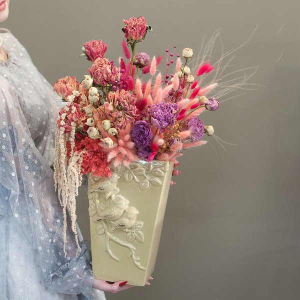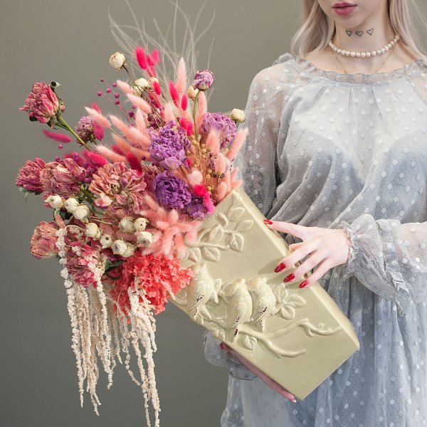 Авторская композиция из сухоцветов в дизайнерской вазе "Вольта-Мантована" - это уникальное сочетание различных видов сухоцветов, которые сохраняют свою красоту и свежесть на протяжении длительного времени. В состав композиции входят такие цветы, как гортензия, лагурус, лен, амарант, пион и ковыль. Это позволяет создать яркий и красочный образ, который будет радовать глаз и поднимать настроение. Ваза, в которую помещены сухоцветы, выполнена в стиле "Вольта-Мантована", что придает композиции особый шарм и изысканность. Высота композиции составляет 60 см, а ширина - 40 см. Это делает ее заметной и привлекательной деталью интерьера. В одной упаковке находится одна авторская композиция из сухоцветов в дизайнерской вазе "Вольта-Мантована". Это позволяет вам выбрать именно тот вариант, который соответствует вашим вкусам и предпочтениям. Выбирая авторскую композицию из сухоцветов в дизайнерской вазе "Вольта-Мантована", вы получаете не просто элемент декора, но и возможность создать уникальную атмосферу в вашем доме или офисе.