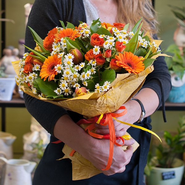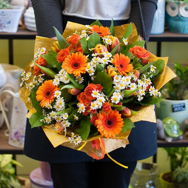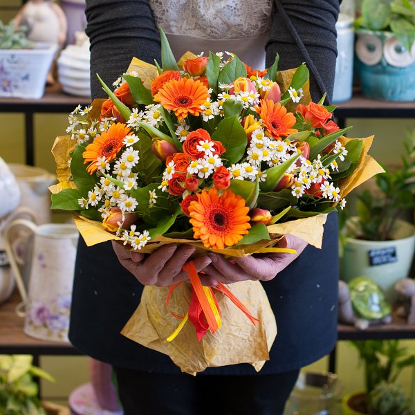 Букет в ярко-оранжевой гамме из минигербер, кустовых роз, ромашек, тюльпанов с декоративной зеленью в подарочной упаковке.