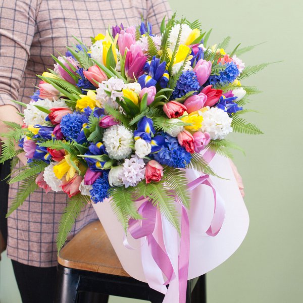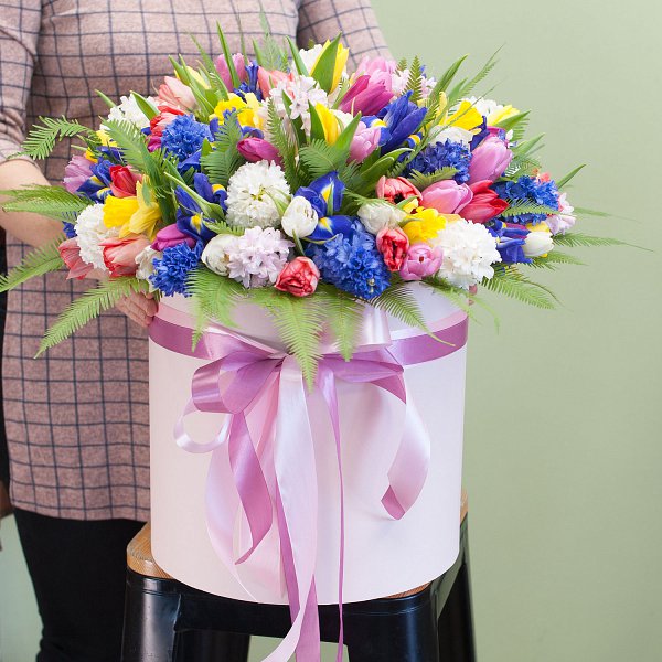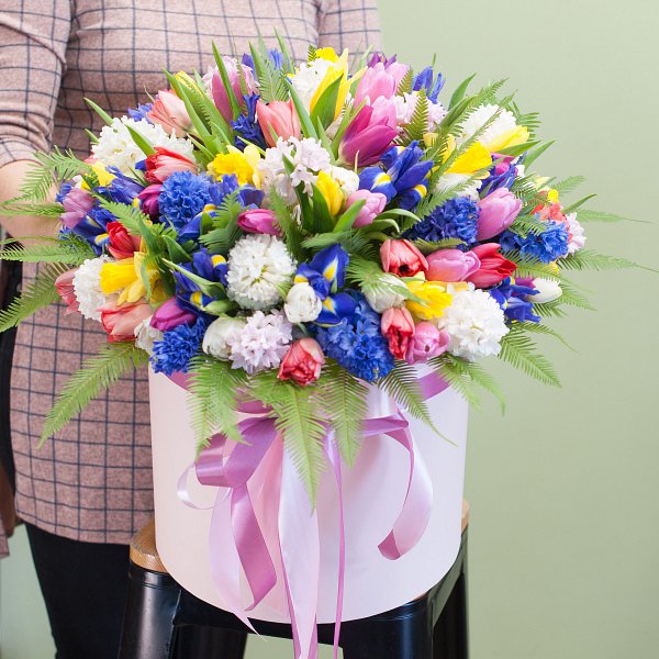 Коробка из весенних цветов: гиацинтов, нарциссов, ирисов, тюльпанов с декоративной зеленью в коробке.