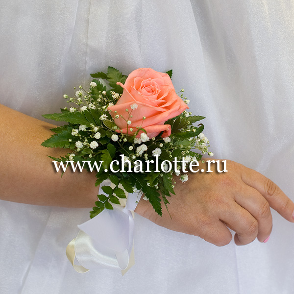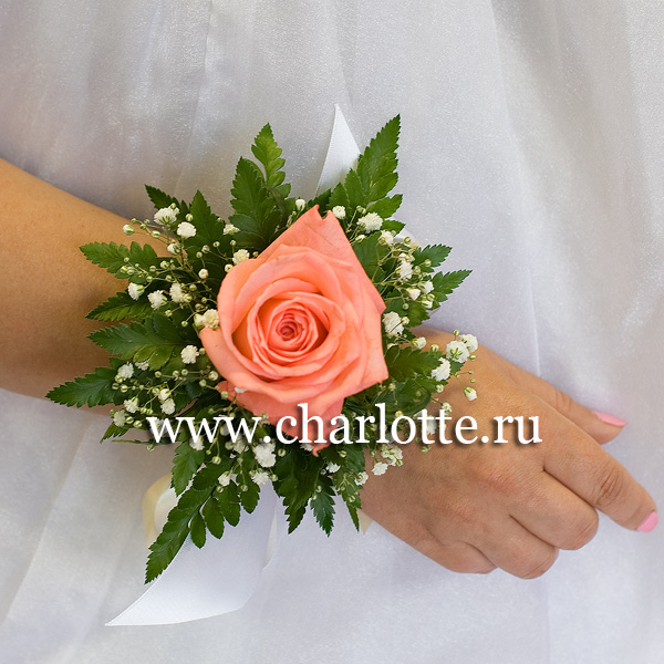 Браслет розы кораллового оттенка, зелени и гипсофилы. По Вашему желанию цветовую гамму браслета можно изменить, для этого звоните в наши салоны цветов или указывайте в разделе "комментарии для флориста" при заказе через интернет.