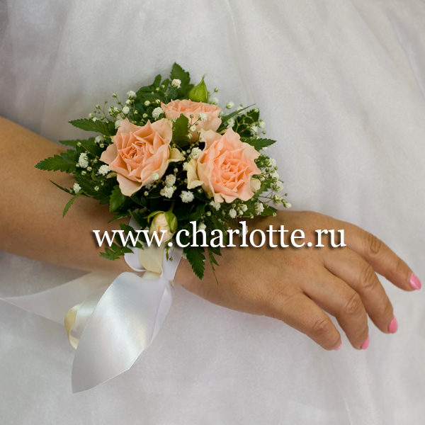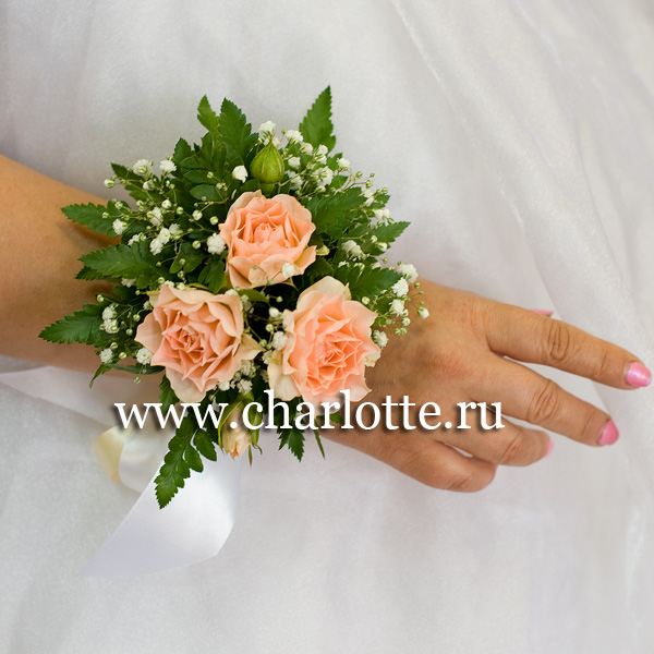 Браслет из кустовых роз, гипсофилы, зелени на минидеко. По Вашему желанию цветовую гамму композиции можно изменить, для этого звоните в наши салоны цветов или указывайте в разделе "комментарии для флориста" при заказе через интернет.