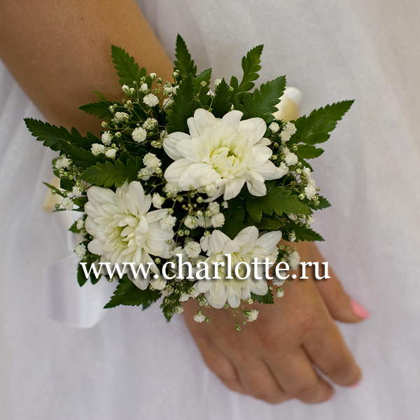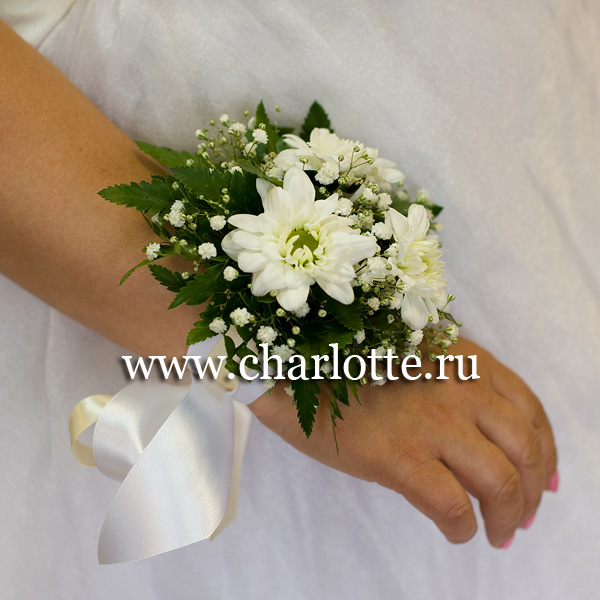 Браслет из хризантем, гипсофилы с декоративной зеленью на минидеко. По Вашему желанию цветовую гамму композиции можно изменить, для этого звоните в наши салоны цветов или указывайте в разделе "комментарии для флориста" при заказе через интернет.