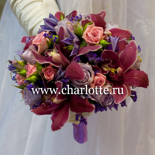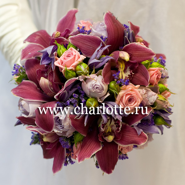 Букет невесты из бордовых орхидей, розовых кустовых роз, фиолетовых кустовых роз,лимониума с декоративной зеленью на портбукетнице. По Вашему желанию цветовую гамму букета можно изменить, для этого звоните в наши салоны цветов или указывайте в разделе "комментарии для флориста" при заказе через интернет.