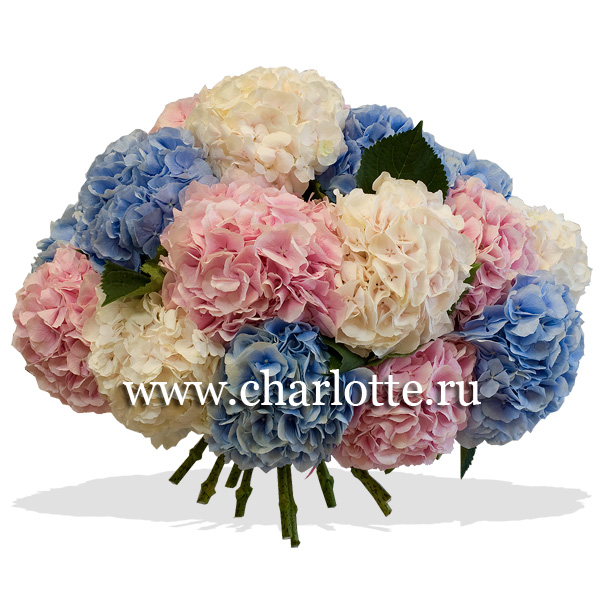 Букет из белых, розовых и голубых гортензий перевязанных лентой. По Вашему желанию цветовую гамму можно изменить, для этого звоните в наши салоны цветов или указывайте в разделе "комментарии для флориста" при заказе через интернет.