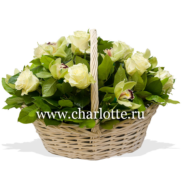 Корзина в бело-зеленых тонах из роз, орхидей с декоративной зеленью. По Вашему желанию цветовую гамму композиции можно изменить, для этого звоните в наши салоны цветов или указывайте в разделе "комментарии для флориста" при заказе через интернет.