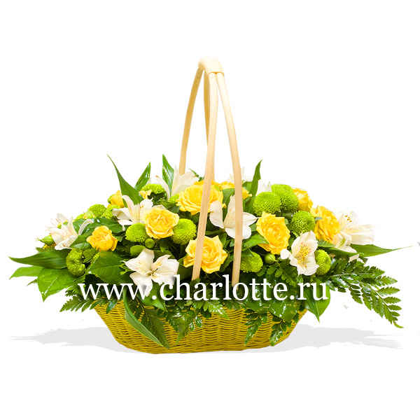Корзина из желтых кустовых роз, альстромерий, хризантем с декоративной зеленью. По Вашему желанию цветовую гамму композиции можно изменить, для этого звоните в наши салоны цветов или указывайте в разделе "комментарии для флориста" при заказе через интернет.
