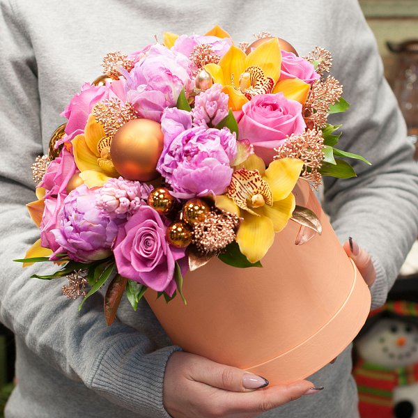 Шляпная коробка в ярких тонах из пионов, гиацтнтов, роз, орхидей, с крашенной скиммией, а так же зеленью и новогодним декором.