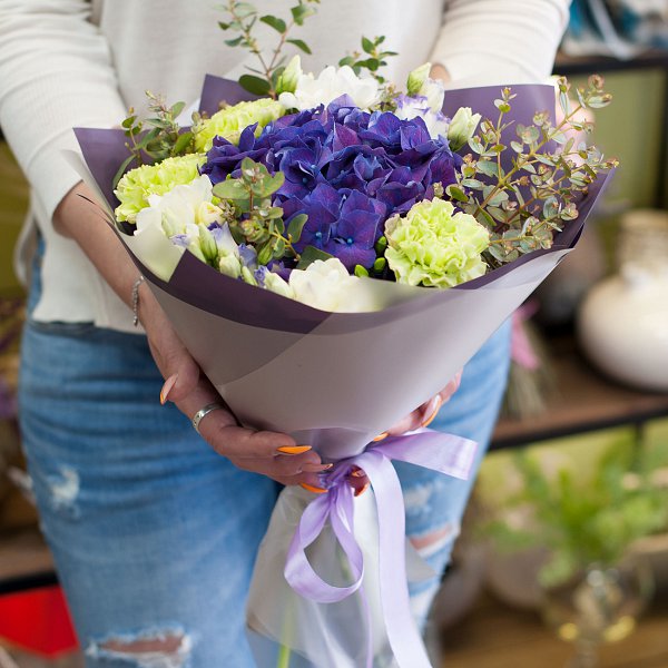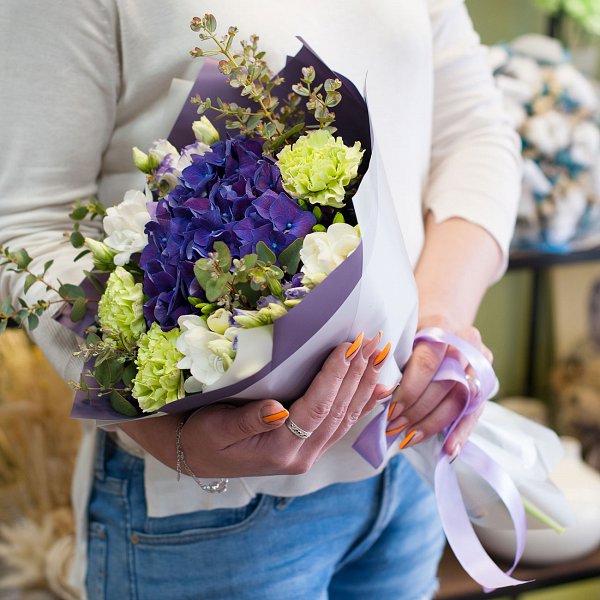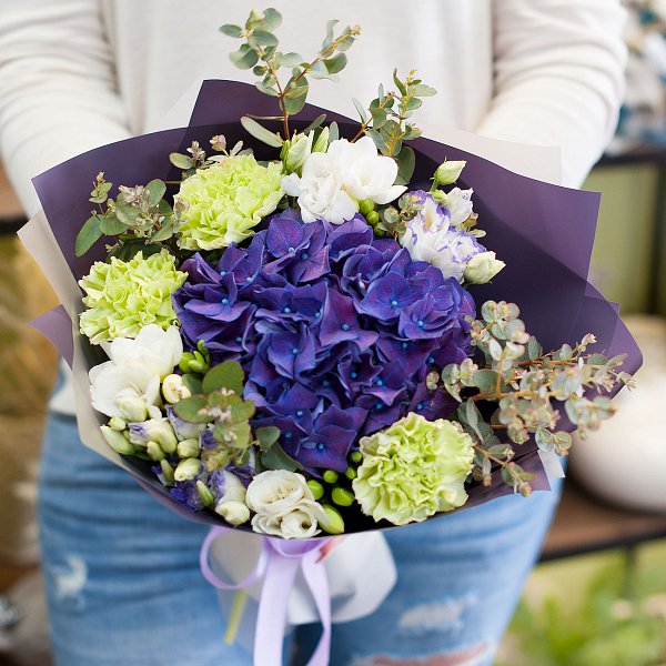 Небольшой букет из фиолетовой гортензии, зеленой гвоздики, бело-синего лизиантьуса, белой фрезии с эвкалиптом в дизайнерской пленке с лентами.