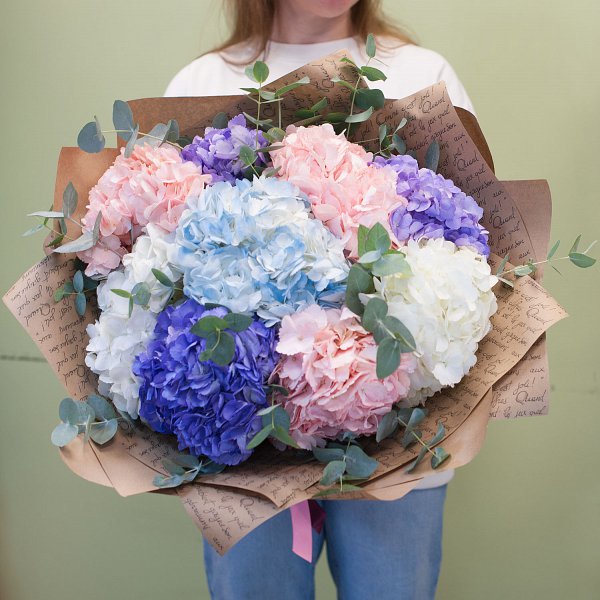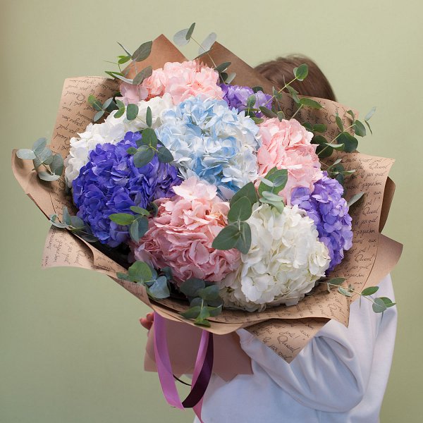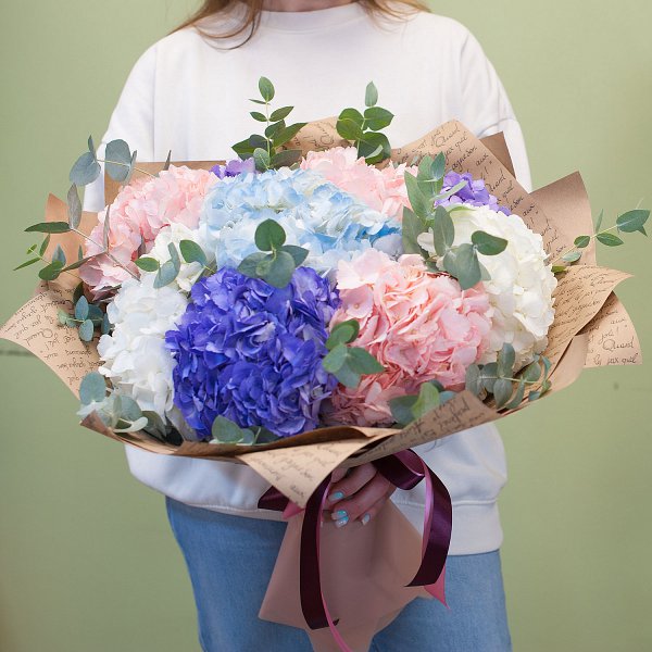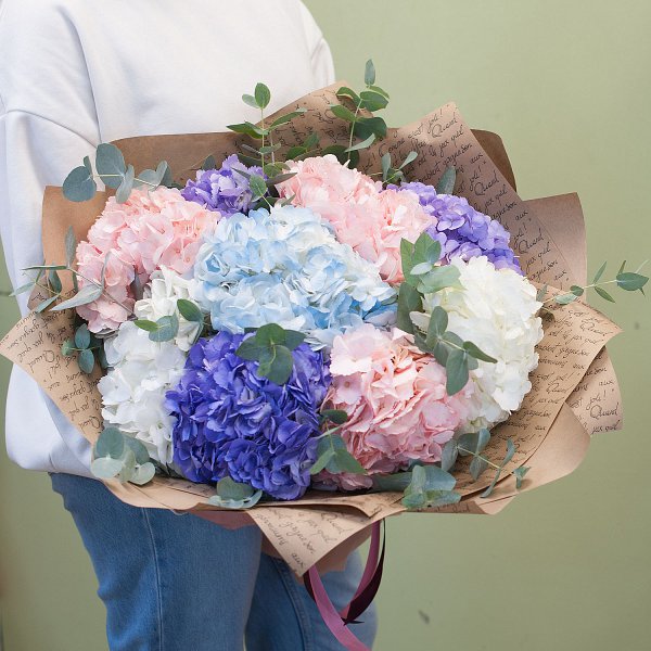 Букет состоит из разноцветных гортензий, которые придают ему неповторимый и роскошный вид.