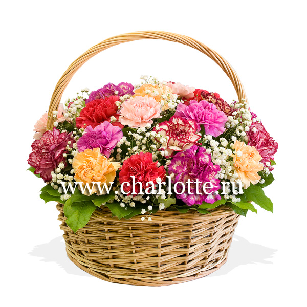 Корзинка в ярких тонах из разноцветных гвоздик, гипсофилы с декоративной зеленью. По Вашему желанию цветовую гамму композиции можно изсенить, для этого звоните в наши салоны цветов или указывайте в разделе "комментарии для флориста" при заказе через интернет.