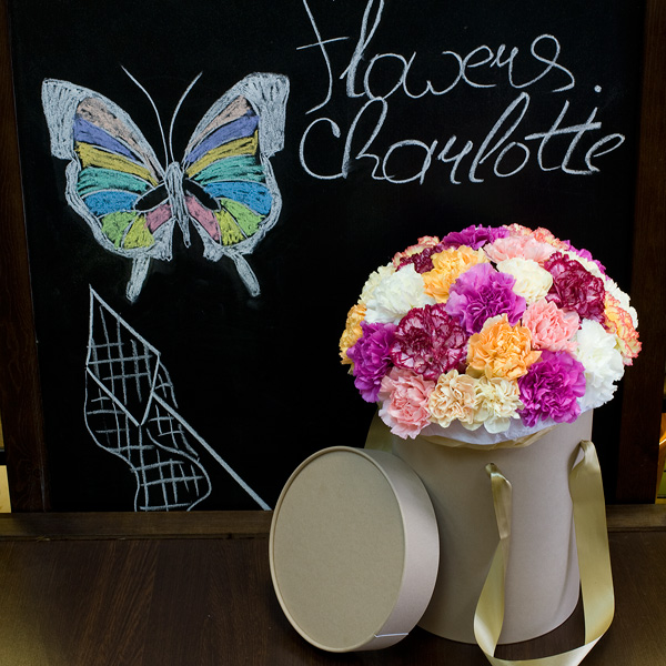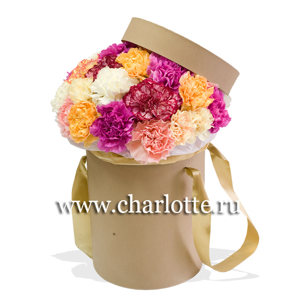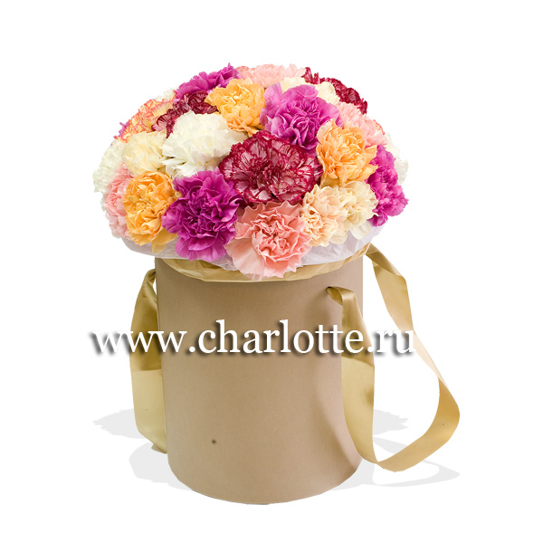 Композиция в шляпной коробке из разноцветных гвоздик. По Вашему желанию цветовую гамму композиции можно изменить, для этого звоните в наши салоны цветов, или указывайте в разделе "комментарии для флориста" при заказе через интернет.