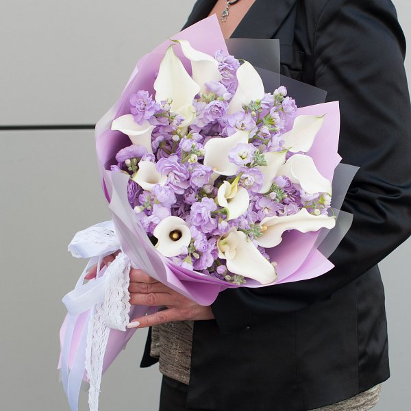 Букет состоит из 23 цветов, включая 13 калл и 10 маттиол.