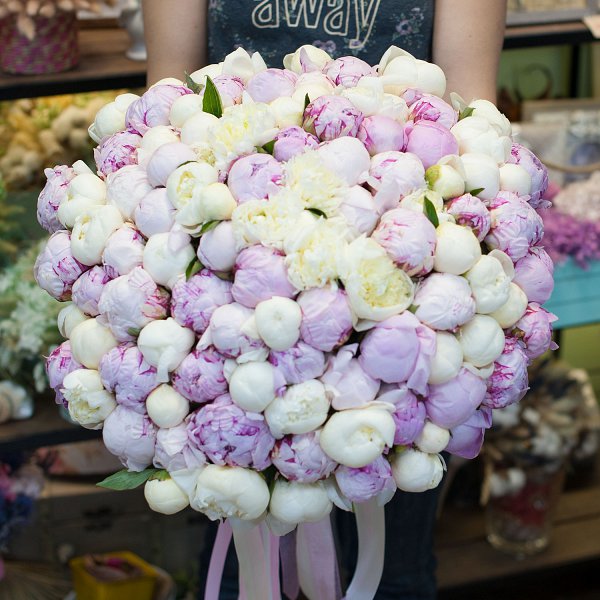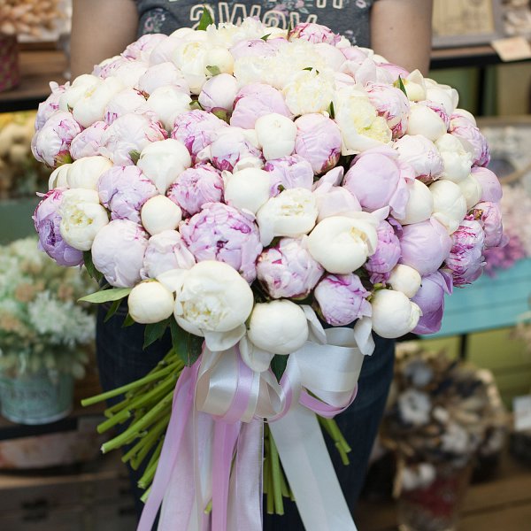 Букет состоит из 101 пиона, что делает его по-настоящему впечатляющим и роскошным.