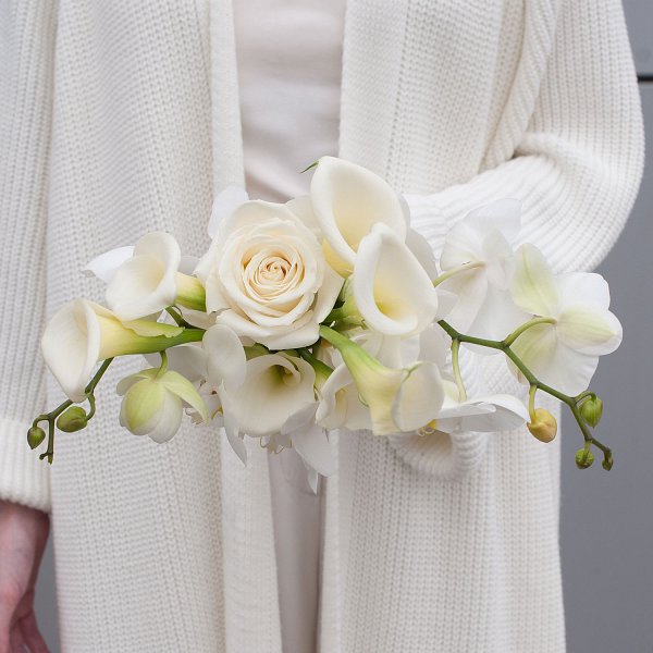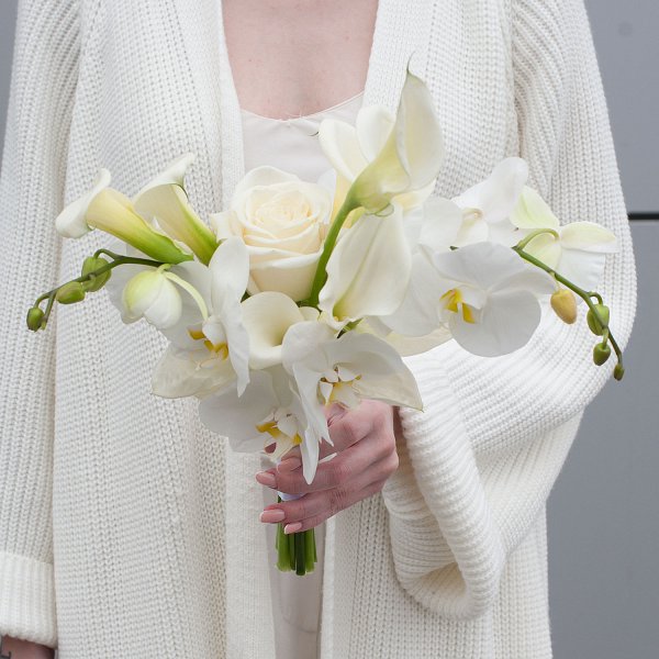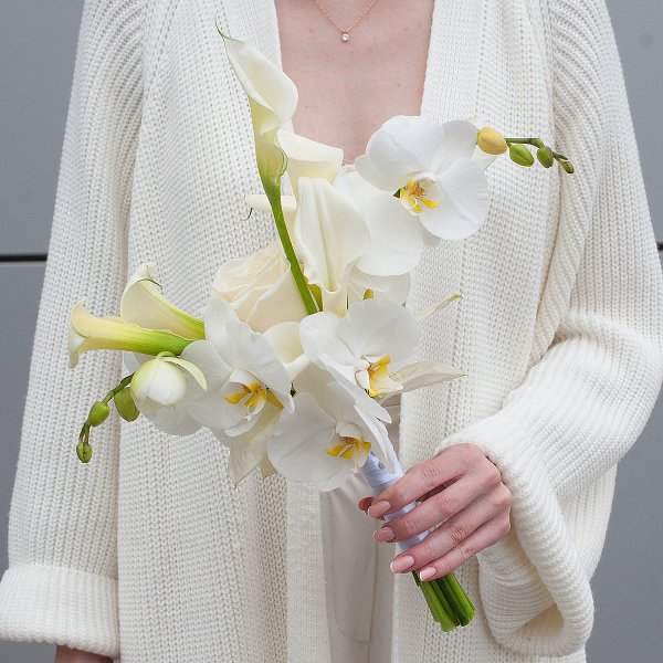 Букет оформлен в белом цвете, что делает его подходящим для любого свадебного торжества. Белый цвет символизирует чистоту и невинность, а также ассоциируется с любовью и преданностью.