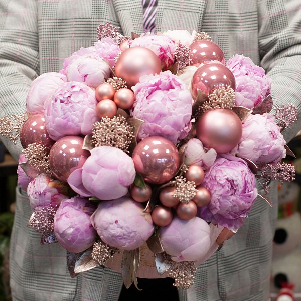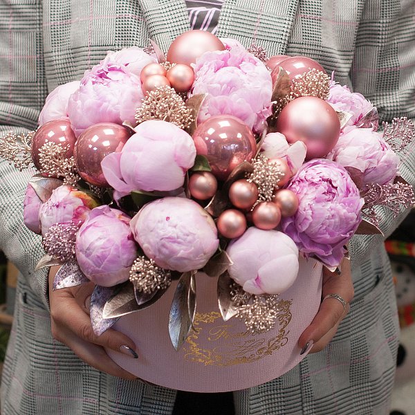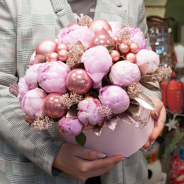 Коробка из розовых пионов с новогодними украшениями и крашенной скимии.
