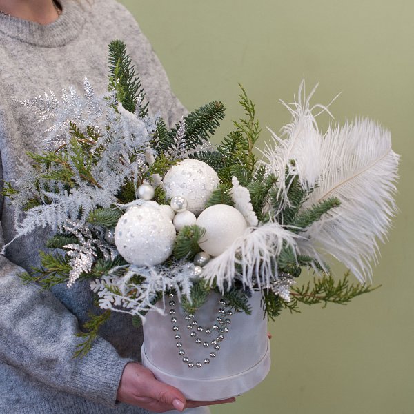 В комплект "Снежка" входят еловый лапник, перья, аспарагус-плюмозус, новогодние украшения и шляпная коробка. Это позволяет вам самостоятельно собрать композицию, выбрать украшения и создать уникальный дизайн.