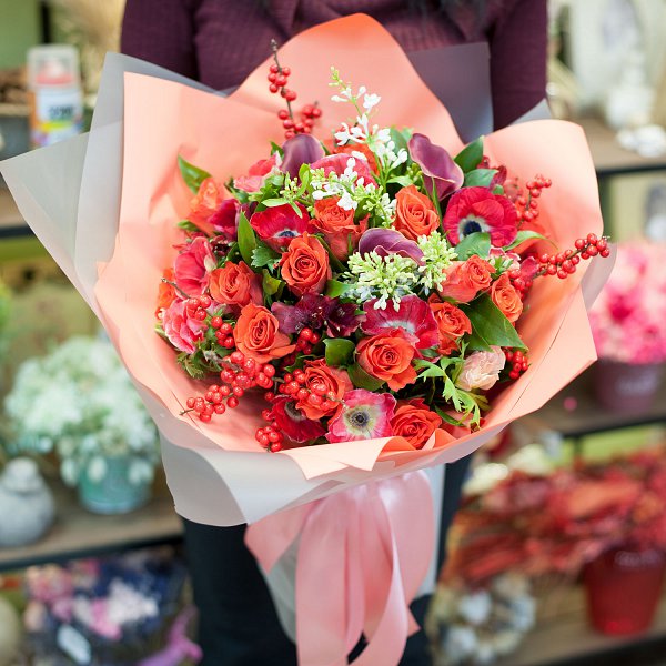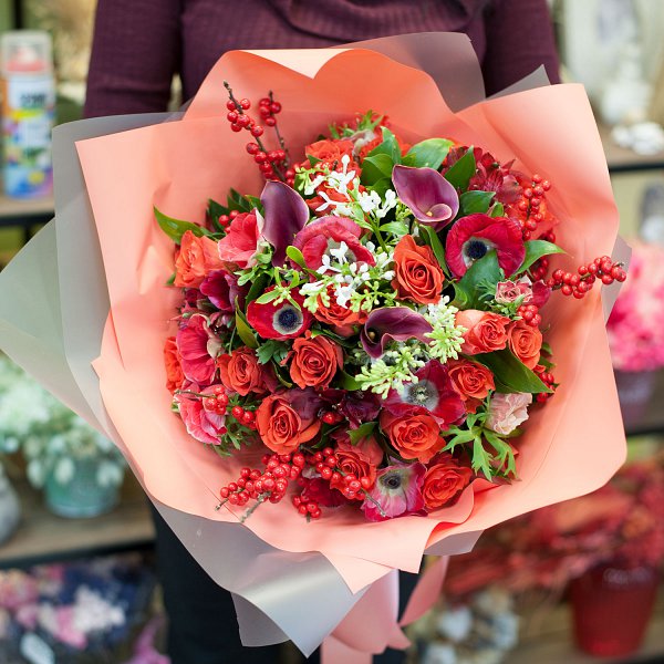 Букет цветов в красных тонах из ярко-красных роз сорта "Эль Торро", красного илекса, белой сирени, калл, красных анемонов, алстромерии с декоративной зеленью в подарочной упаковке.