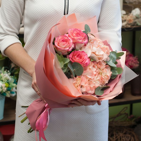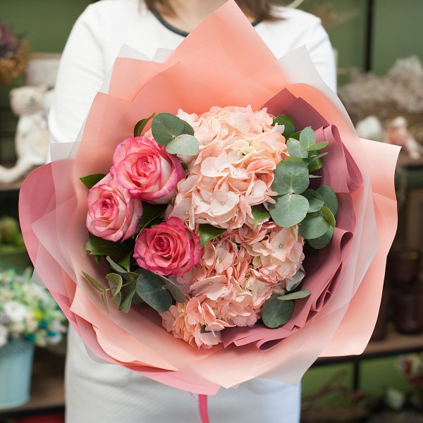 Букет состоит из пяти видов цветов: гортензии и розы, что придает ему неповторимый и яркий вид.