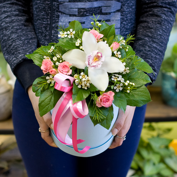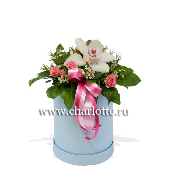 Коробка из белой орхидеи цимбидиум, нежно-розовой кустовой розы, белого восковника с декоративной зеленью в шляпной коробке. По Вашему желанию цветовую гамму композиции можно изменить, для этого звоните в наши салоны цветов или указывайте в разделе "комментарии для флориста" при заказе через интернет.