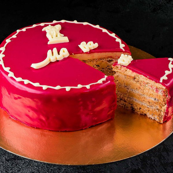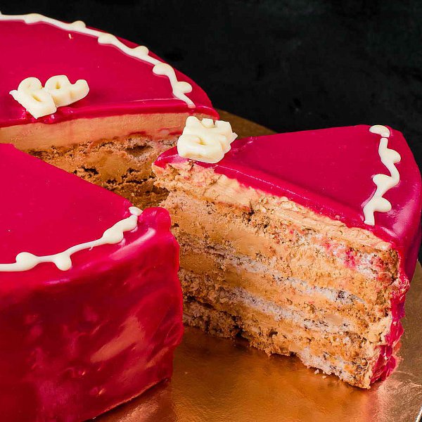 Сгущенное с сахаром молоко (молоко цельное, сахар), ядро ореха фундука дробленное, масло сливочное, сахар, белок сухой яичный, ядро ореха фундука тертое, белый шоколад (сахар, какао-масло, молоко сухое цельное, эмульгатор лецитин соевый, натуральная ваниль), гель (глюкоза, вода питьевая, сахар, фруктоза, желирующий агент пектин, регулятор кислотности лимонная кислота, консервант сорбат калия), коньяк (коньячный дистиллят, умягченная вода, сахарный сироп, краситель сахарный колер I простой), краситель натуральный кармин.