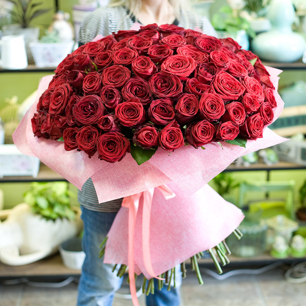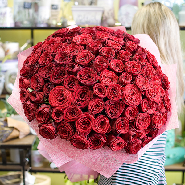 Букет из 101-й крупной красной розы 80 см в подарочной упаковке. Доставляется по Москве и Санк-Петербургу.