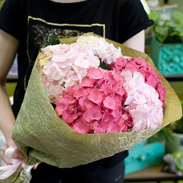 Букет из 5 гортензий розовых оттенков в дизайнерской бумаге крафт.
