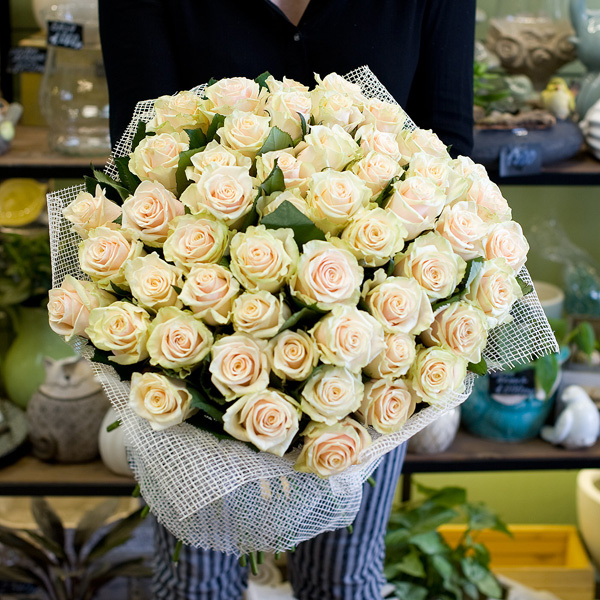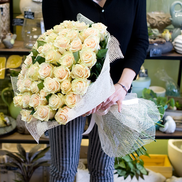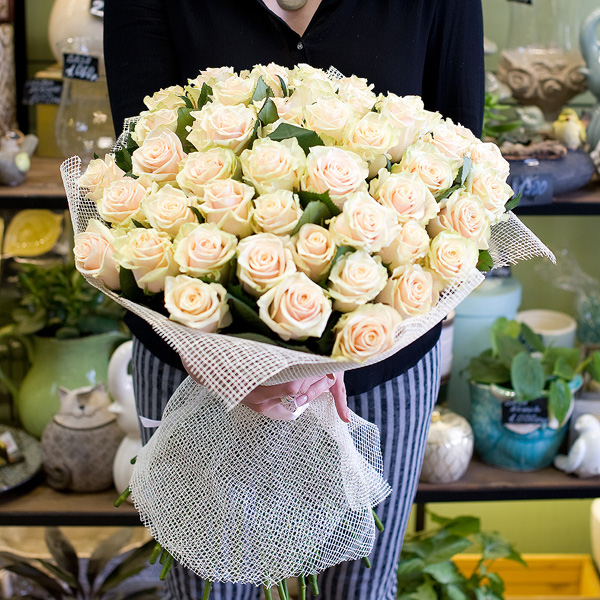 Букет из кремовых роз (60 см) талея (51 роза) в натуральной упаковке-сетка. Вы можете поздравить свою любимую, жену, маму, бабушку или ребенка всегда свежими цветами из наших мастерских в Москве и Санкт-Петербурге.