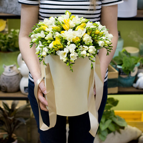 Нежная, ароматная и просто очень красивая композиция в шляпной коробке с весенними цветами- фрезиями (35 шт) в бело-желтой гамме. Доставляется по Москве и Санкт Петербургу.