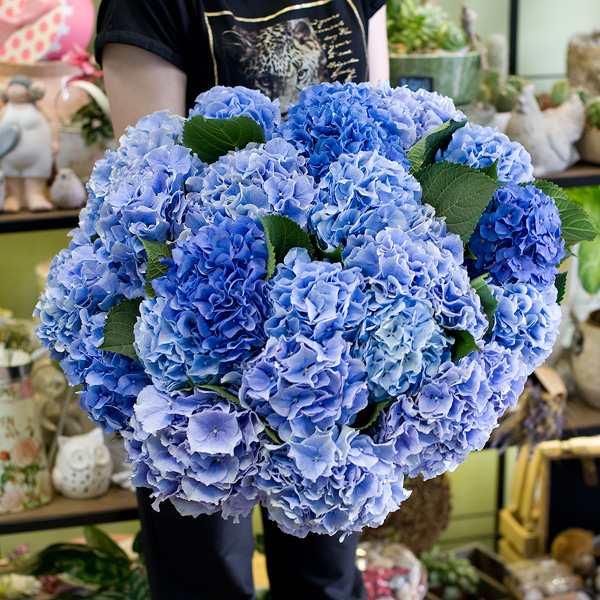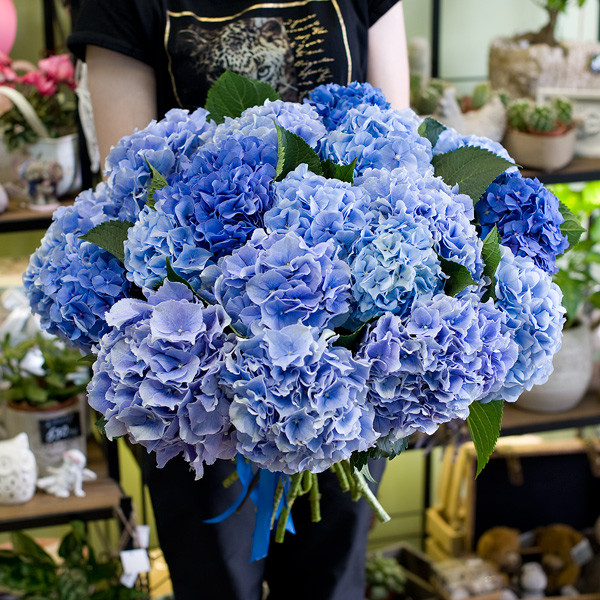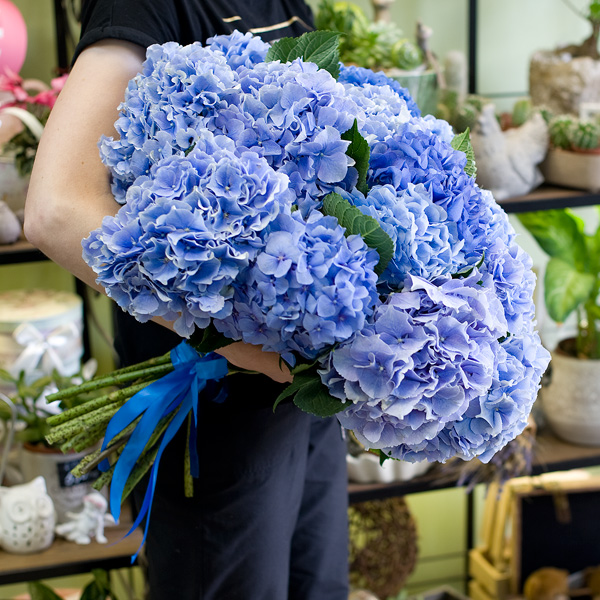 Букет из 21-ой голубой и синей гортензии станет прекрасным подарком, если вы действительно хотите кого-то поразить размером и красотой этих цветов.