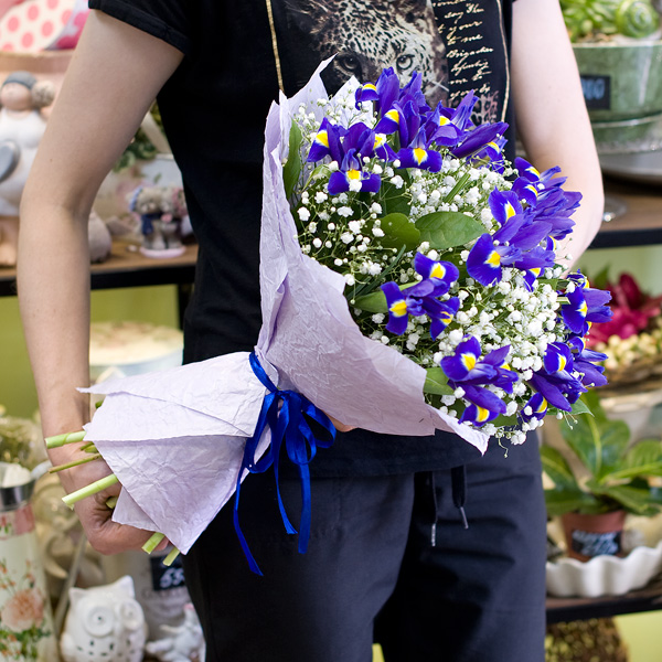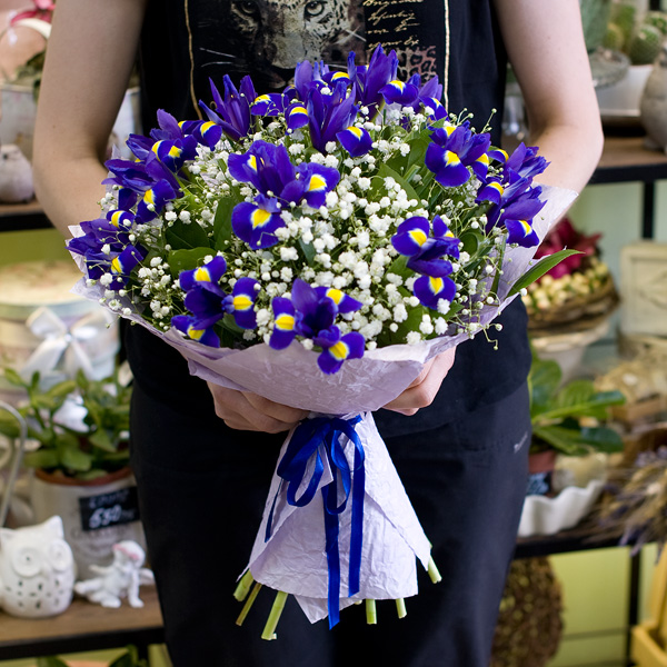 Букет в бело-синей гамме из 15-ти синих ирисов и нежнейшей белоснежной гипсофилы с декоративной зеленью в дизайнерской бумаге крафт. Такой прекрасный букет хорошо подходит для подарка как мужчине, так и женщине, так же вы можете подарить его по любому поводу. Доставляется по Москве и Санкт-Петербургу.