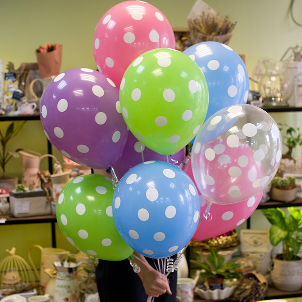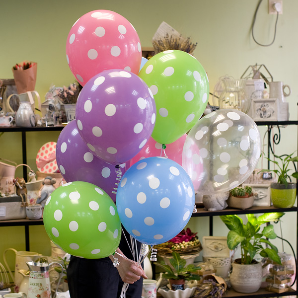 Букет из разноцветныз воздушных латексных шаров в горошек. По Вашему желанию цветовую гамму шаров можно изменить, для этого звоните в наши салоны цветов или указывайте в разделе "комментарии для флориста" при заказе через интернет.