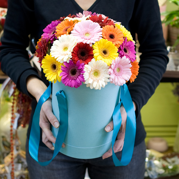 Разноцветные минигерберы в шляпной коробке (29 шт). Доставляется по Москве и Санкт-Петербургу.