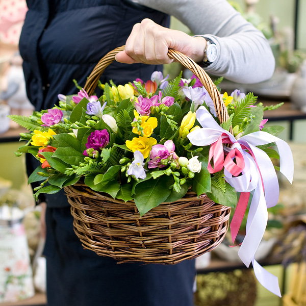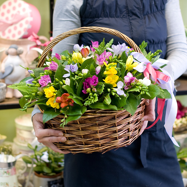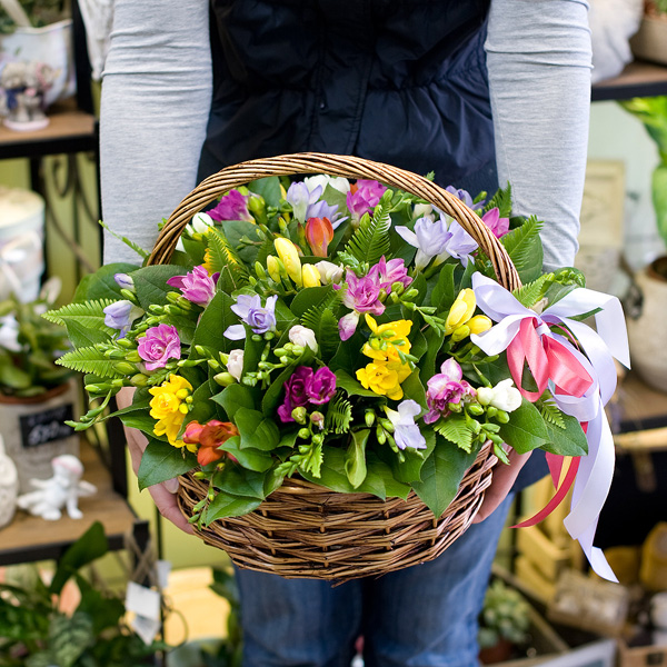 Разноцветные фрезии с декоративной зеленью в подарочной корзинке. Доставляется по Москве и Санкт-Петербургу.