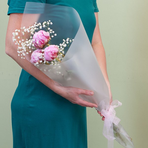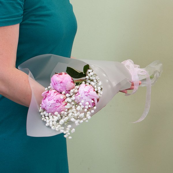 Букет состоит из двух видов цветов - пионов и гипсофилы. Пионы известны своей красотой и ароматом, а гипсофила добавляет воздушности и легкости композиции.