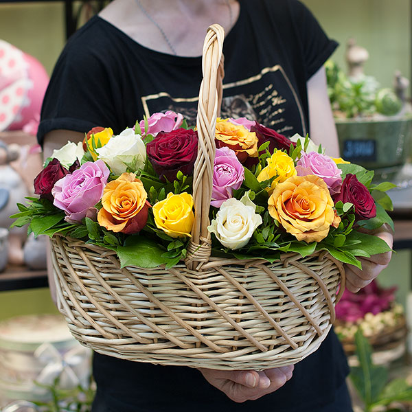 Корзина из разноцветных кенийских роз с декоративной зеленью.