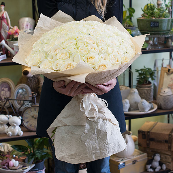 Букет из 101 белой розы в дизайнерской бумаге крафт.