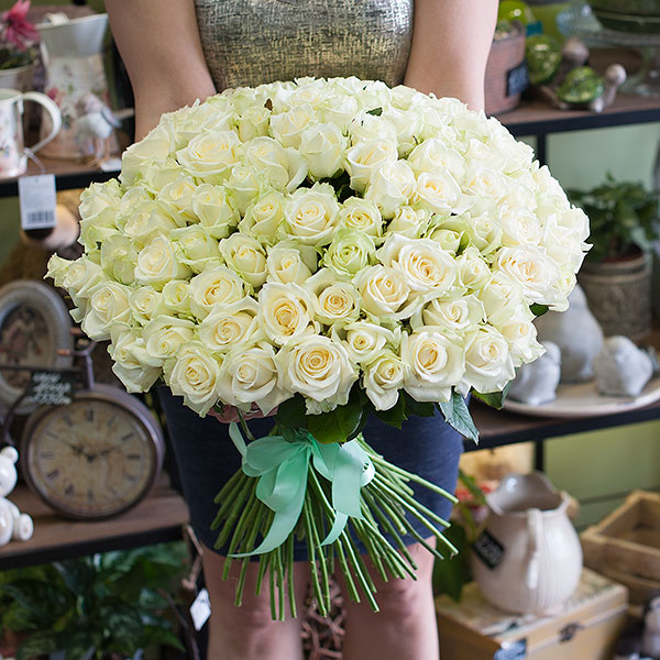 Букет из 101-й белой розы 50 см, перевязанный лентой. Доставляется по Москве и Санкт-Петербургу.